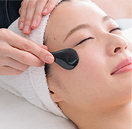 浄化作用のある黒曜石のかっさを使い、ツボを刺激。コリをほぐし、老廃物の排出を促します。西洋の技術と東洋の伝統を融合させたエバグレならではのトリートメントで、目元スッキリ。